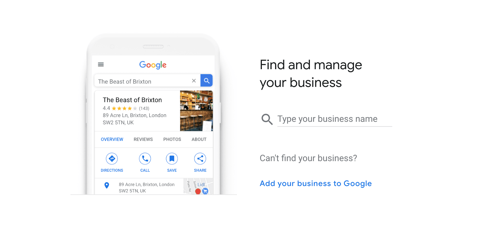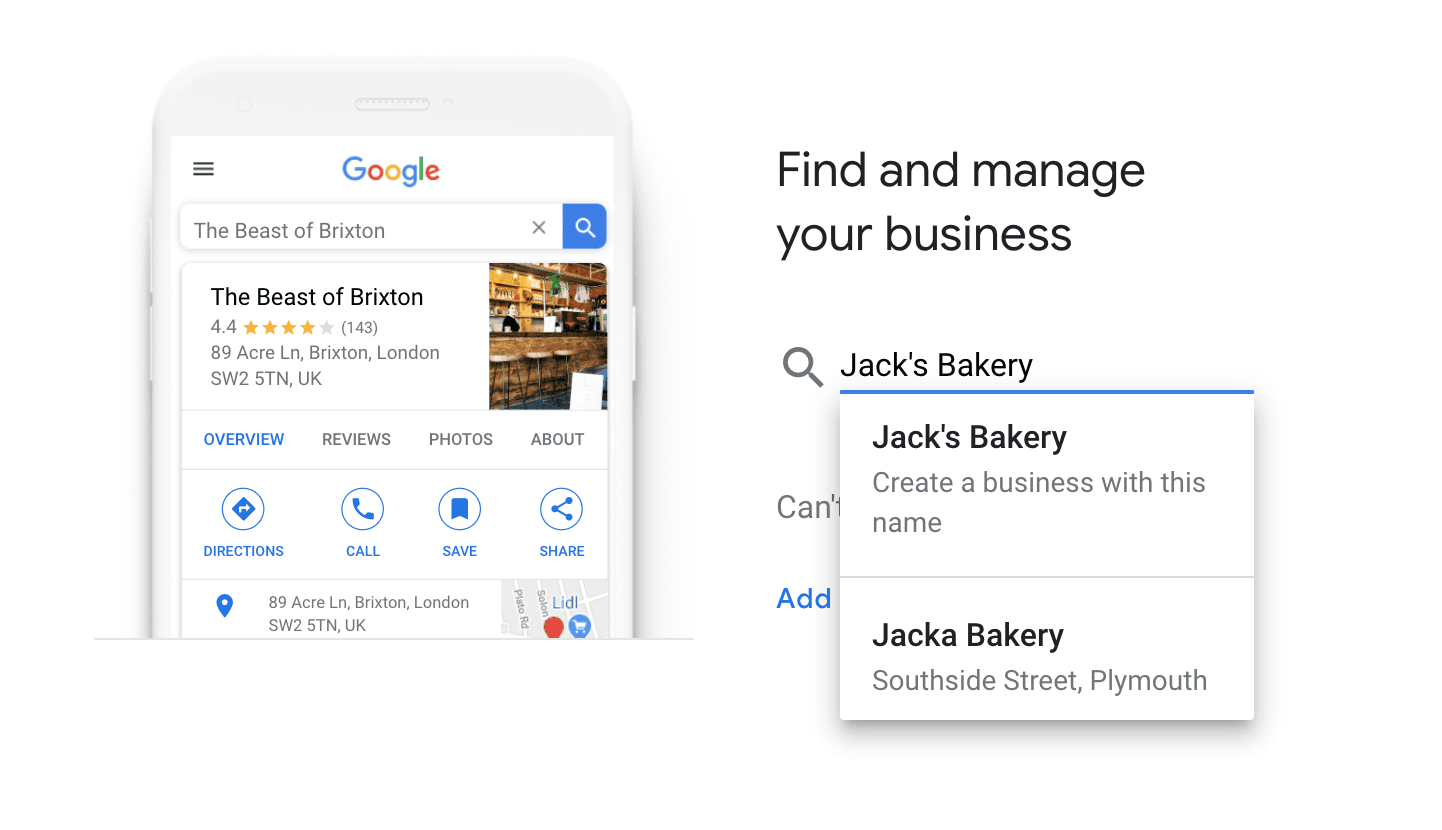 Type the name that your customers would know you as. You’ll see existing business listings with similar names, and/or an option to Create a business with this name.