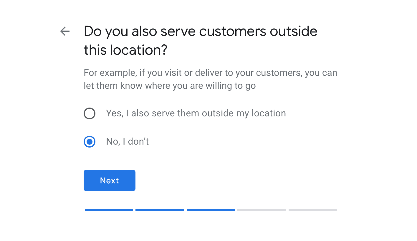 Google will next ask if you visit or deliver to customers, and if so, where you deliver to or which areas you serve. Make a choice and click Next. If you choose Yes, Google will ask for more details.