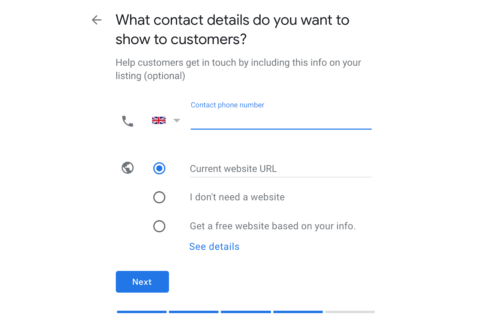 The next step is to provide a phone number and website address (if you have one). Google can even create a basic website for you too.